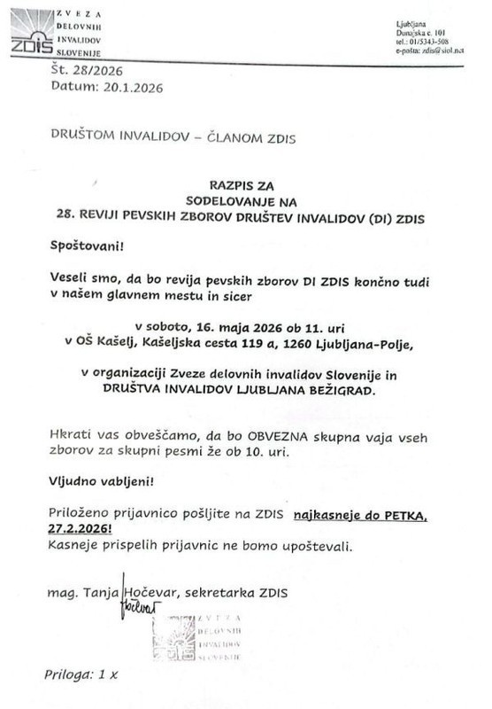 Prejeli smo povabilo, da se prijavimo na Razpis za sodelovanje na 28. reviji pevskih zborov društev invalidov ZDIS. Revija bo potekala v soboto, 16. maja 2026 ob 11.uri v OŠ Kašelj. Veselimo se sodelovanja.