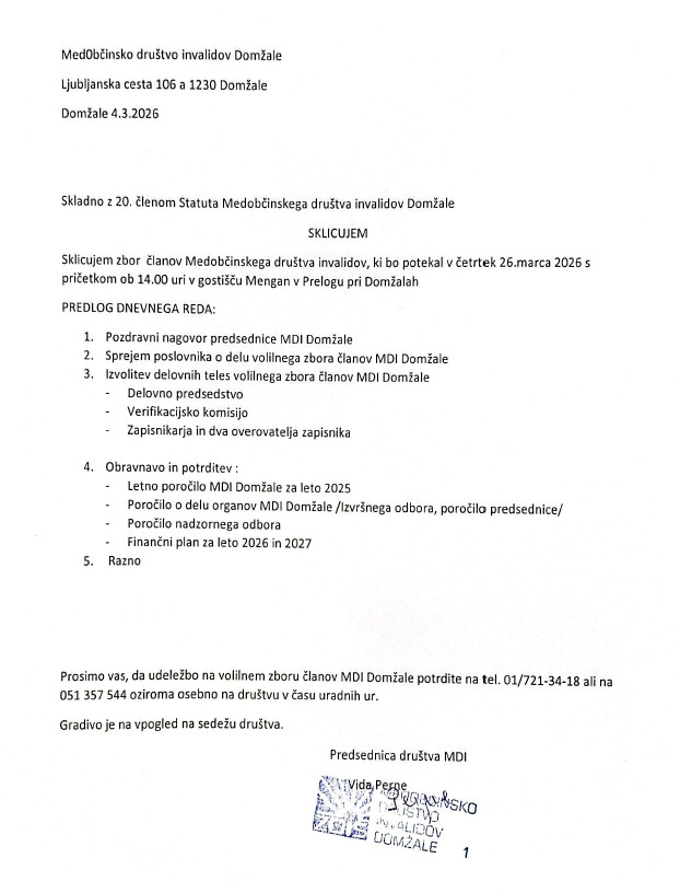 Predsednica društva Vida Perne sklicuje zbor članov Medobčinskega društva invalidov Domžale, ki bo potekal 26. marca 2026 ob 14.uri v gostišču Mngan v Prelogu pri Domžalah.