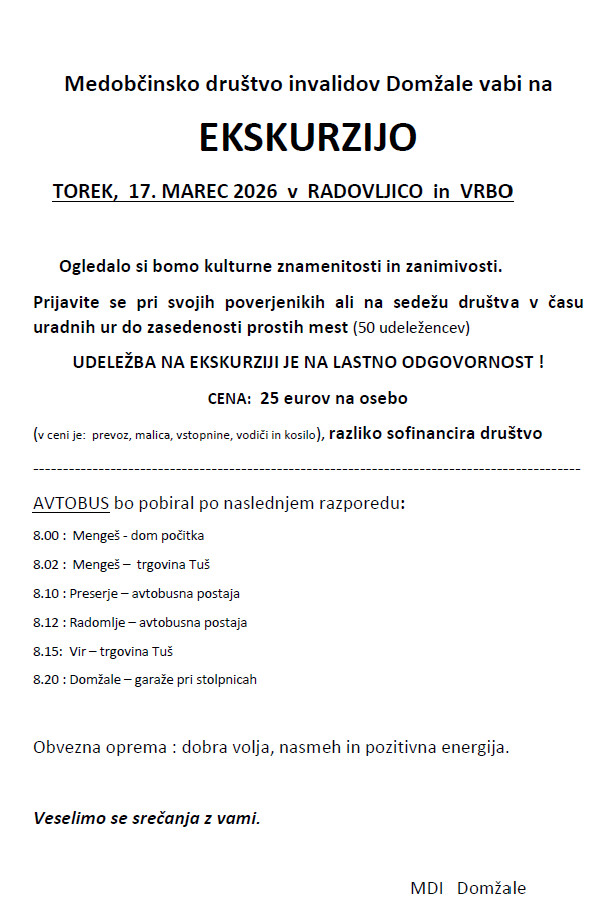 Medobčinsko društvo invalidov Domžale vabi na ekskurzijo dne, 17. marca 2026 v Radovljico in Vrbo.